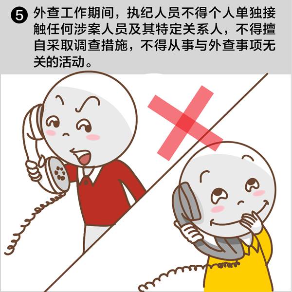 外查工作期间,执纪人员不得个人单独接触任何涉案人员及其特定关系人,不得擅自采取调查措施,不得从事与外查事项无关的活动。